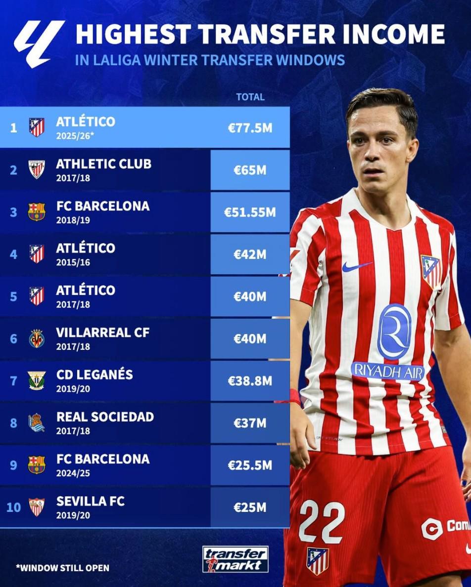 西甲历史冬窗转会收入榜: